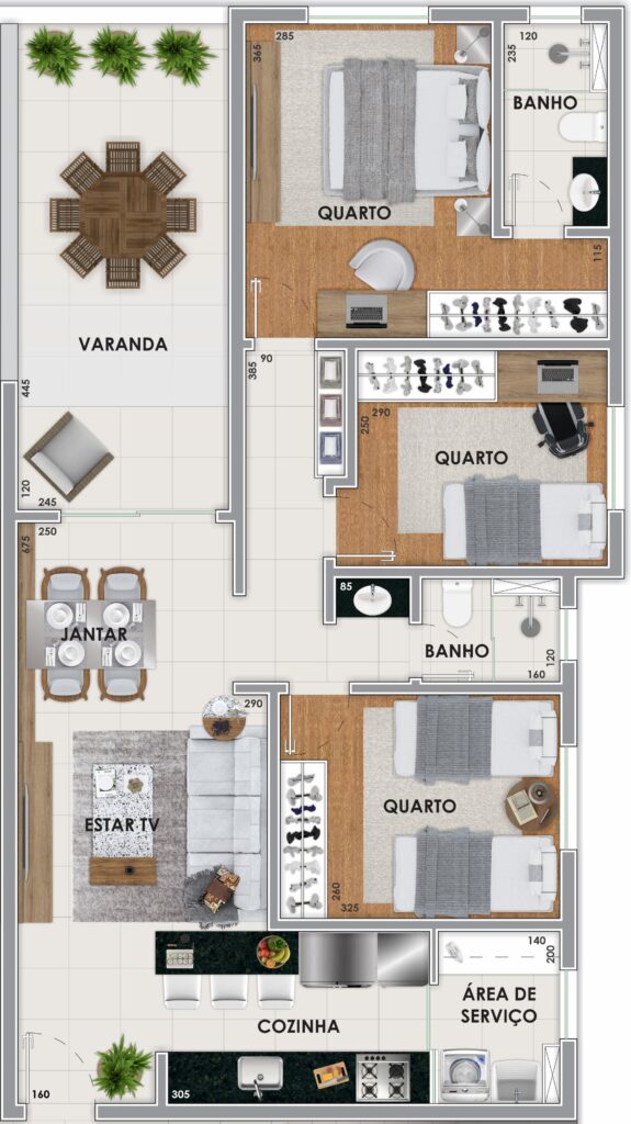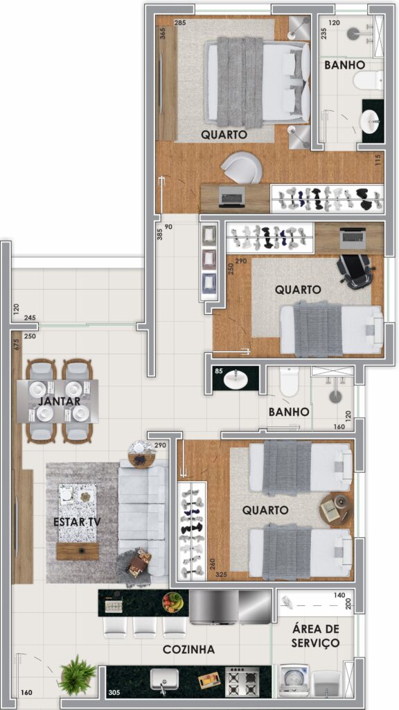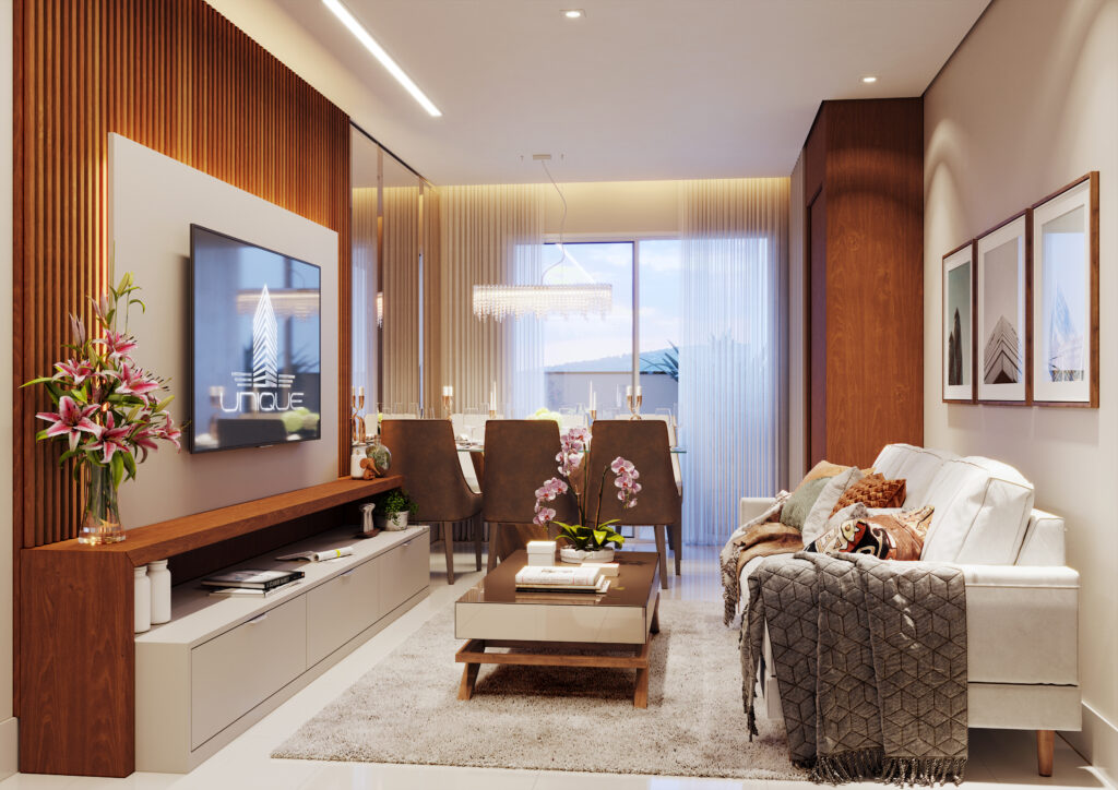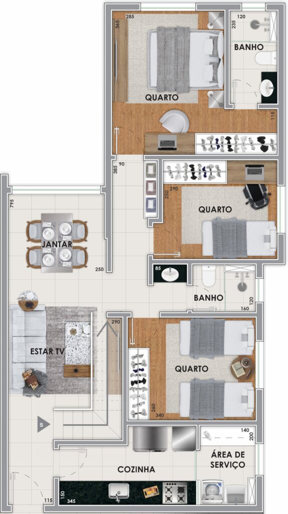 Apartamentos com sala de estar para 02 ambientes e varanda, 03 dormitórios, sendo 01 suíte com espaço closet, banho social tipo toucador, corredor de circulação com rouparia, cozinha estilo americano, área de serviços e 02 vagas privativas de garagem.